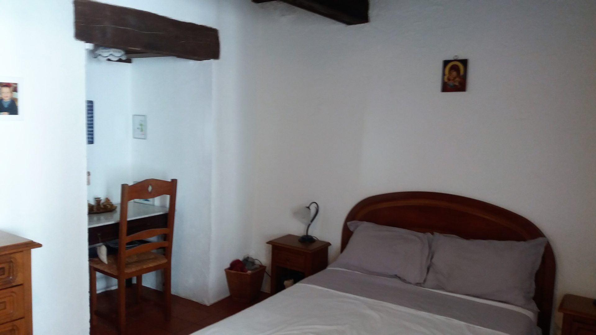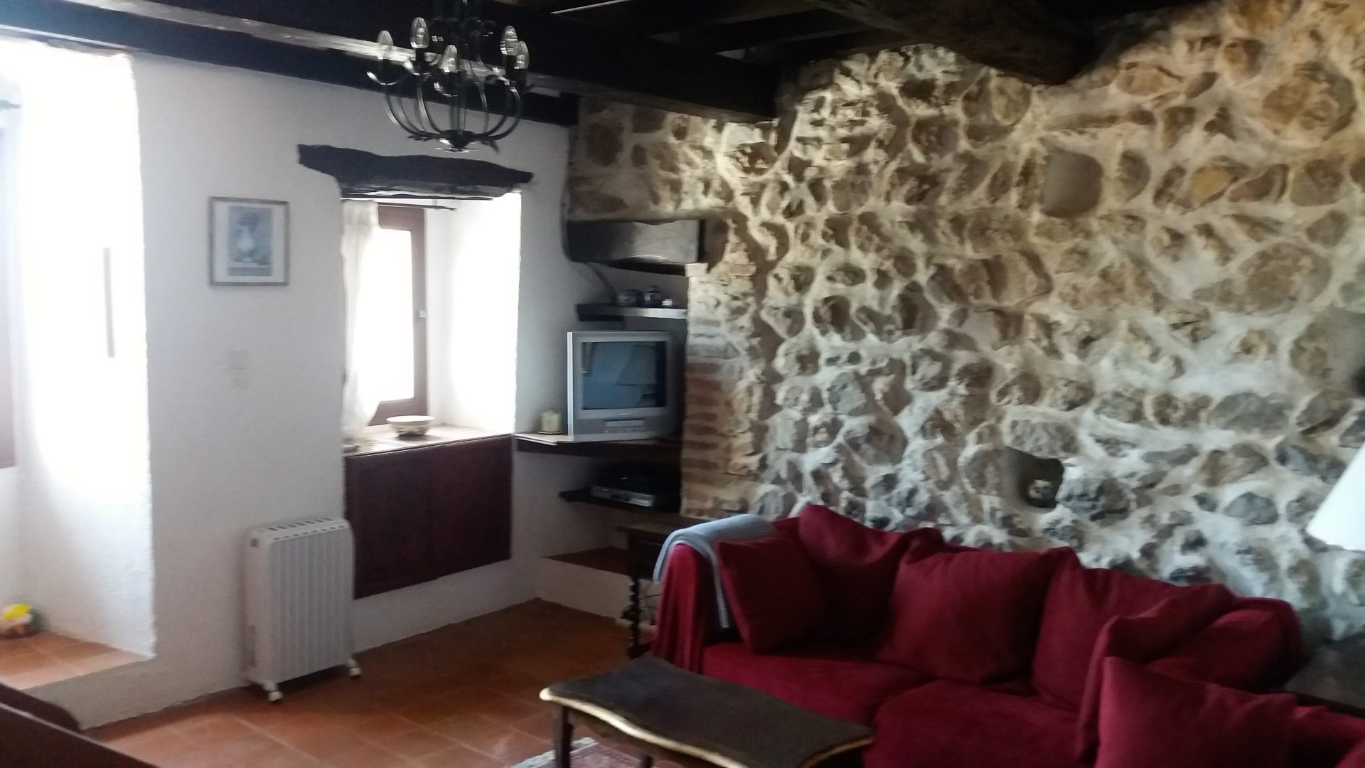 Huset er stort nok til en familie med overnattende gæster. Med synlige sten indenfor og store loftsbjælker.
